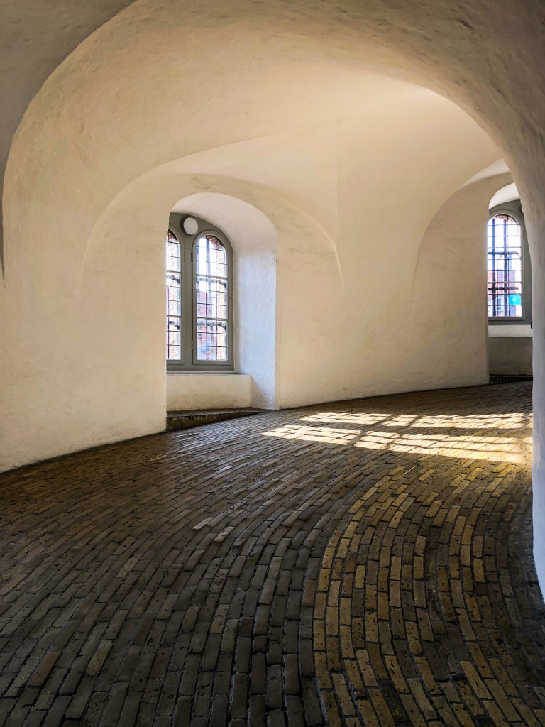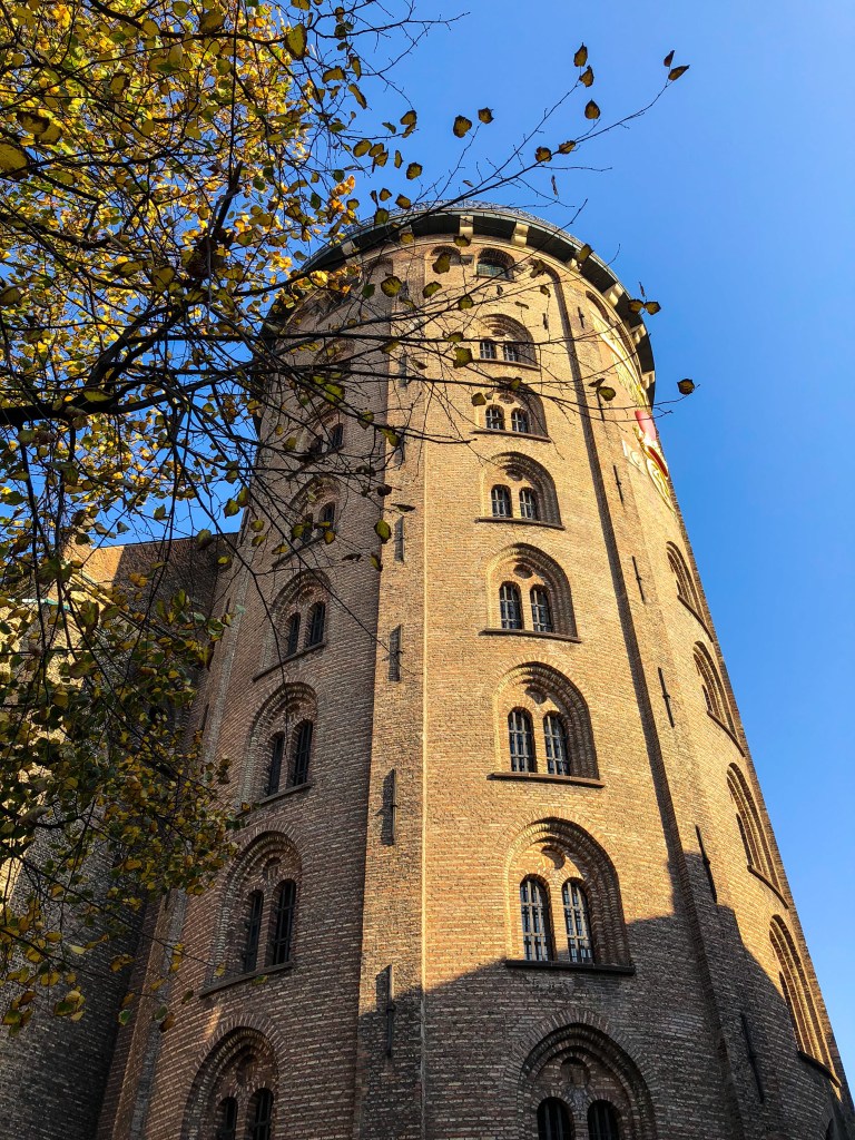 Hierna hebben we wel zin om iets actief te doen.  De Rundetaarn (Ronde Toren) ligt op hooguit 5 minuutjes fietsen en vanaf de top heb je een mooi 360graden uitzicht over Kopenhagen. De Rundetaarn is buggyproof want je beklimt de toren d.m.v. een spiraalgang. Op weg naar de top, komen we steeds nisjes tegen waarin Kaatje het geweldig vindt om te verstoppen. Ze rent steeds een stuk vooruit de bocht om, gaat in een nis zitten en roept heel hard BOE!!! als wij langskomen… Dikke pret elke keer weer opnieuw. Jasmijn en Lieve grinniken er wat om; pfff nog een keer Kaat?!? Ben je nu nog niet klaar?! Boven genieten we van het waanzinnige 360graden uitzicht voor we weer terug gaan naar beneden. Dat is misschien nog wel leuker dan naar boven… De dames hebben bedacht dat het supertof is om heel hard naar beneden te rennen door de spiraalgang … Ze hebben het gepresteerd om zonder valpartijen beneden aan te komen…