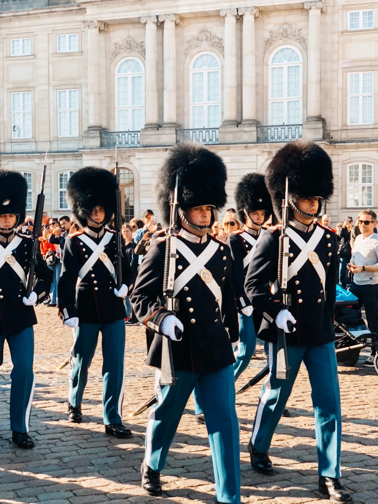 Op het grote, met oude keien bestraat plein voor slot Amaliënborg  zien we al een hoop mensen en politieagenten staan. Oké hier zitten we goed, zometeen is de wisseling van de wacht. Nadat we nog net een plekje kunnen vinden waar we alles goed kunnen zien, horen we in de verte de wachters al aan komen; strak in de maat marcheren ze voorbij met hun hoge zwarte bonthoeden en geweren onder hun arm… Met open mond kijken Jasmijn en Lieve hoe ze aan ons voorbij trekken. Kaatje wil vooral heel graag opgetild worden en roept steeds: kijk mama ze hebben pistolen!!! Indrukwekkend om deze traditie een keer mee te maken.