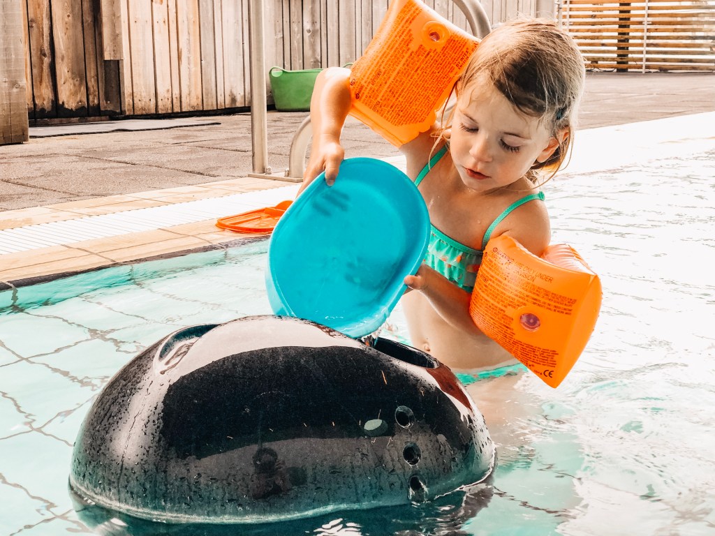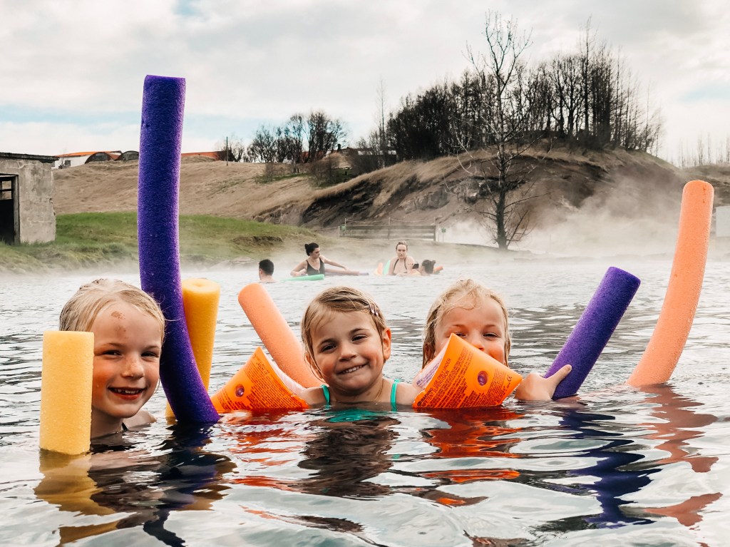 Het andere zwemuitje ging naar de Secret Lagoon. Dat is een spa met een groot bad wat heerlijk water bevat van zo’n 40 graden. Je kunt gebruik maken van een soort foam buizen die blijven drijven. Je kunt er lekker op hangen en relaxen of er, net als onze meiden, mee spelen. Als ik zou moeten kiezen vind ik Laugarvatn Fontana Spa toch meer de moeite waard met kinderen.