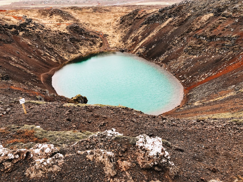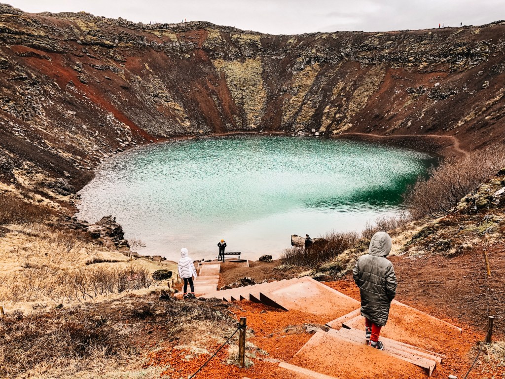 We hebben ook de Kerid vulkaankrater bezocht met het prachtige blauw-groene kratermeer. Dit is een van de weinig plekken waar je een (klein) entreebedrag moet betalen. ( zo’n €3,- p.p.) Wij wandelden een rondje over de kraterrand en zijn via de trappen afgedaald om het kratermeer van dichtbij te bekijken.
