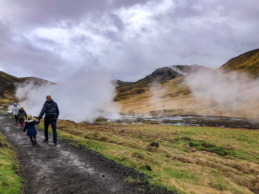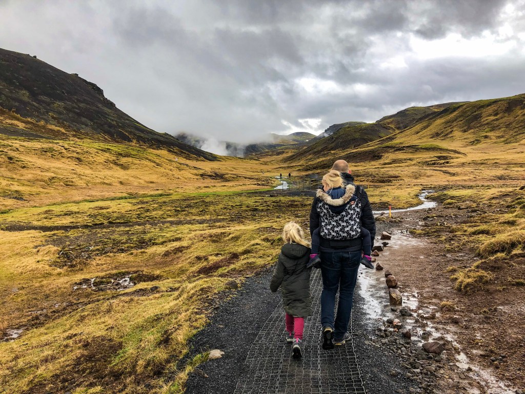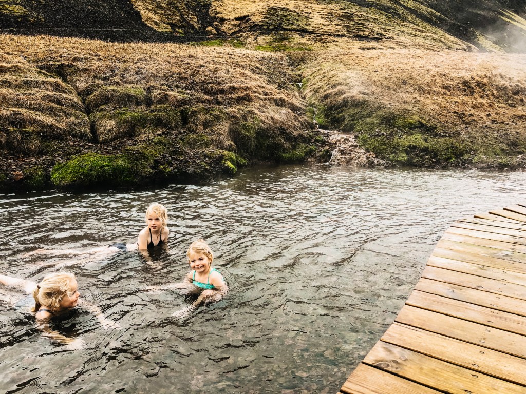Echt een dikke vette aanrader deze hike! Je wandelt 3 km enkele reis door geothermisch actieve bergen naar een warme rivier waar je heerlijk kunt baden. Ook al is het buiten -4, het water is daar nog steeds lekker warm! De heenweg is best pittig want je moet redelijk wat klimmen. Jasmijn (8) en Lieve (6) hebben het helemaal zelf gelopen. Kaatje (3) heeft wat stukjes bij papa in de draagzak gezeten. Het is echt waanzinnig mooi; we genieten van de mooiste vergezichten, steken smalle riviertjes met stapstenen over, zien overal stoom en rookpluimen opstijgen vanwege de geothermische activiteit en we komen een intens blauw waterpoeltje tegen. Aan het eind lopen we zelfs langs borrelende en kokende hottubs! Na al het harde werken word je beloond; je kunt heerlijk baden in de warme rivier! Loop wel even wat verder door over de houten vlonders richting de bron want daar is het water warmer dan aan het begin.