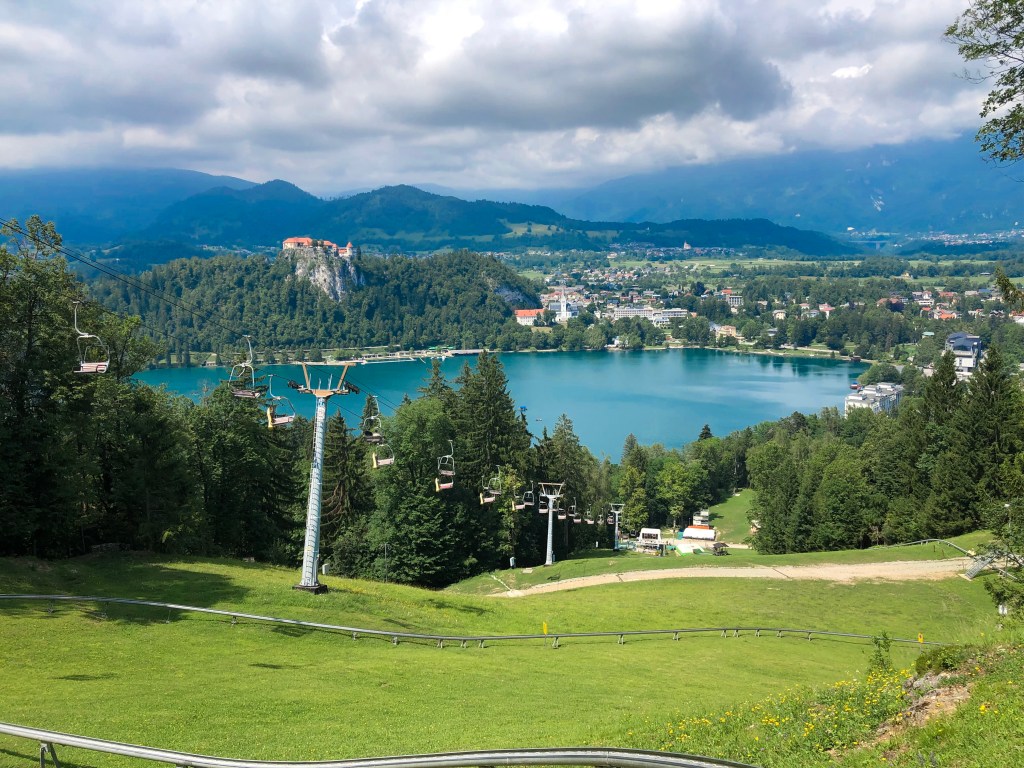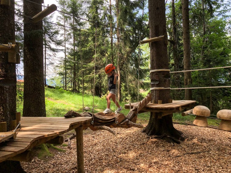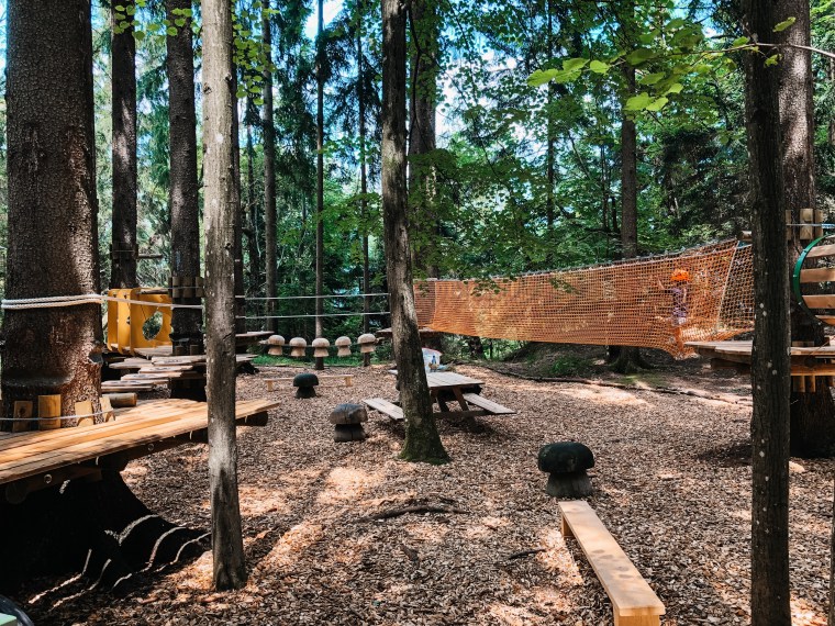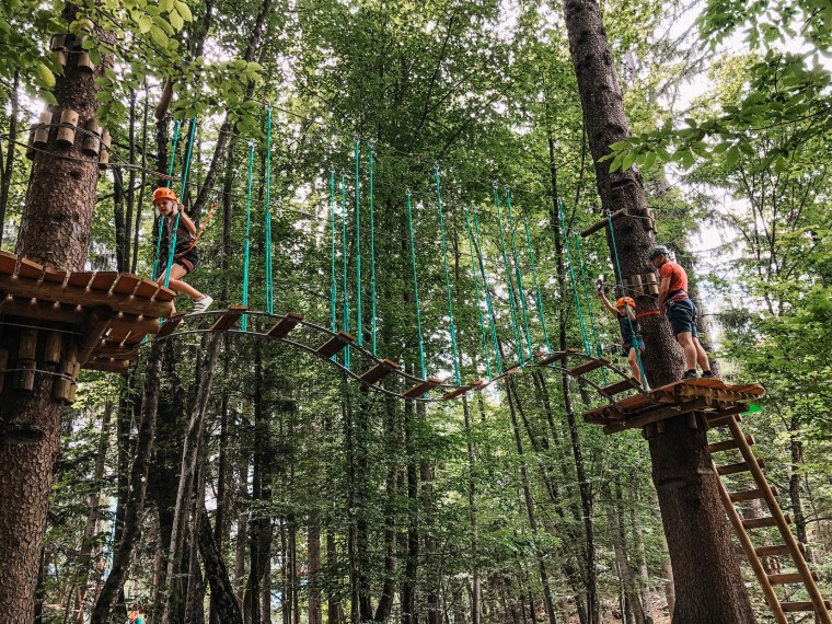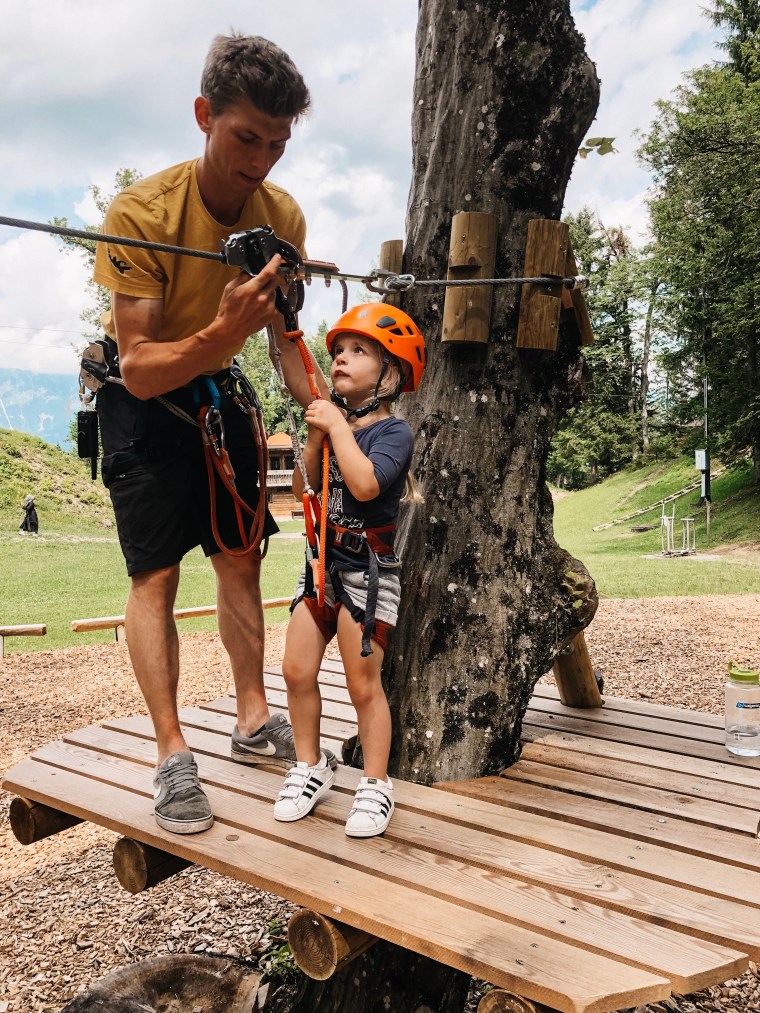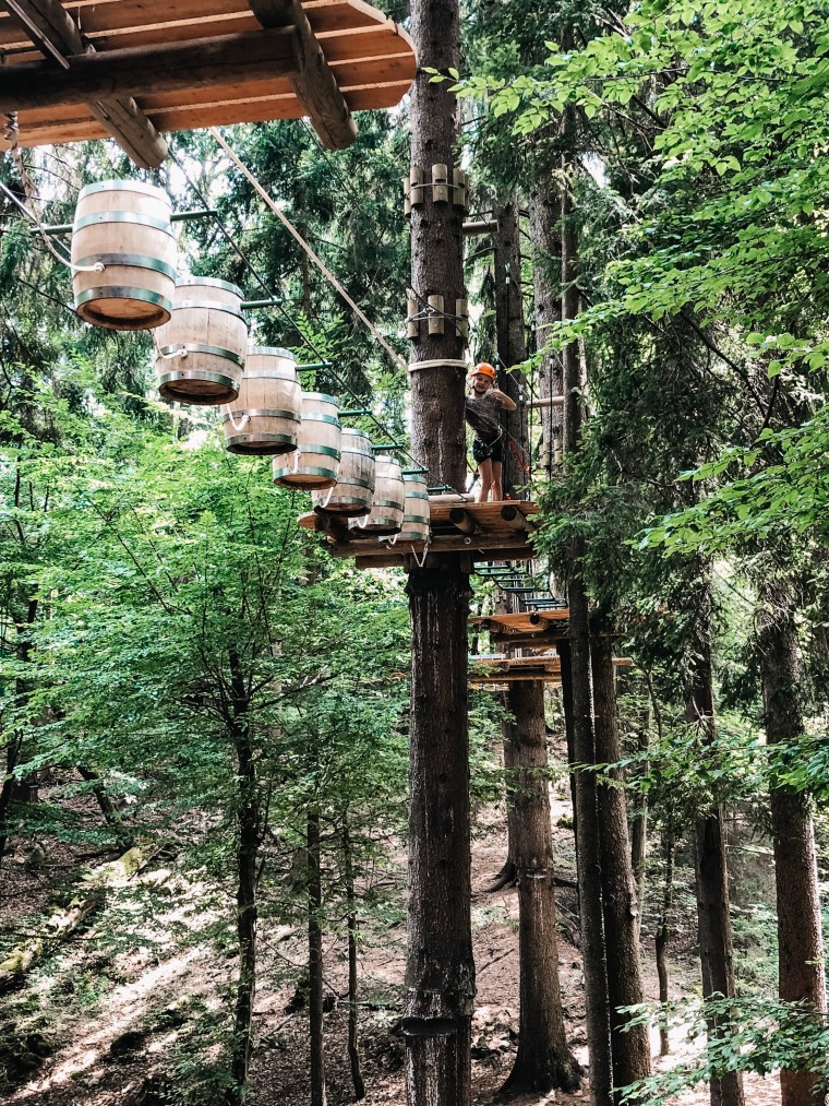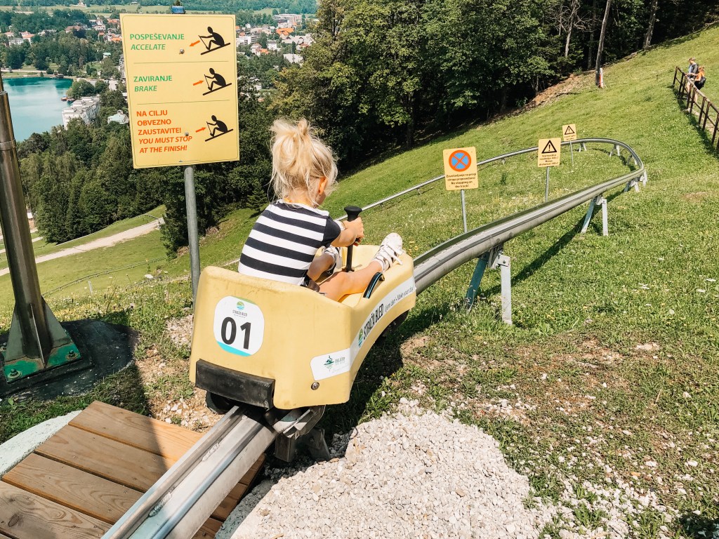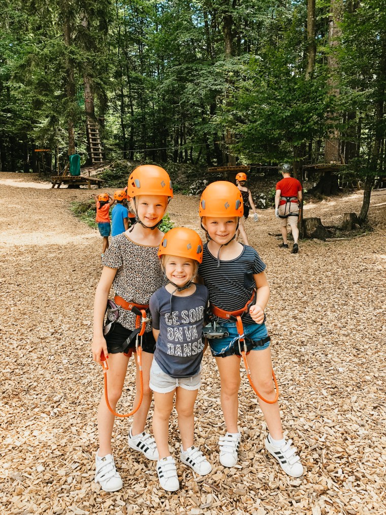 Op een van de heuvels rondom het meer zijn allerlei toffe, uitdagende activiteiten te vinden voor jong en oud. Bij Straza Bled kun je met een stoeltjeslift naar boven of je wandelt de hele weg omhoog. Op de heuvel vind je Adventure Park Bled. Tussen de boomtoppen kun je ziplinen (je roetsjt aan een kabel van boomtop naar boomtop) en verschillende klimparcoursen volgen. Je krijgt een veiligheidstuig aan en een helm op en wordt vastgemaakt aan een kabel (superveilig, kan nooit los gaan, pas aan het einde van het parcours is dat mogelijk). Er wordt samen met een instructeur een duidelijke uitleg en oefenparcours doorlopen en daarna mag je zelf aan de bak. Kinderen beginnen met het makkelijkste parcours en dan wordt steeds gekeken hoe het gaat en of ze door kunnen naar een graadje moeilijker. Jasmijn (8) en Lieve (6) hebben alle parcoursen heel dapper doorlopen behalve de laatste en moeilijkste. Daar waren ze letterlijk nog te klein voor want de bovenste kabel waar je aan vasthoudt tijdens het klimmen was te hoog voor ze. Het is best een pittige activiteit, je kind moet zeker geen hoogtevrees hebben. Ik had vooraf ook wat twijfels of het niet te moeilijk of eng zou zijn maar onze meiden houden van klimmen en klauteren en vonden het gelukkig geweldig! Manlief ook trouwens. Het grote parcours is geschikt voor kinderen vanaf ongeveer 5 jaar. De lengte van je kind is belangrijker dan de leeftijd; ze moeten namelijk de bovenste kabel goed kunnen vastpakken. Jongere kinderen kunnen terecht op het babyparcours. Onze dochter Kaatje (3) vond dat geweldig! Ze kreeg ook een helm op en mocht op een parcours op een halve meter boven de grond haar klimkunsten laten zien. Naast het babyparcours vind je er ook een kabelbaan en als kers op de taart mocht ze een stukje ziplinen over de mini zipline! Kaatje voelde zich super stoer!