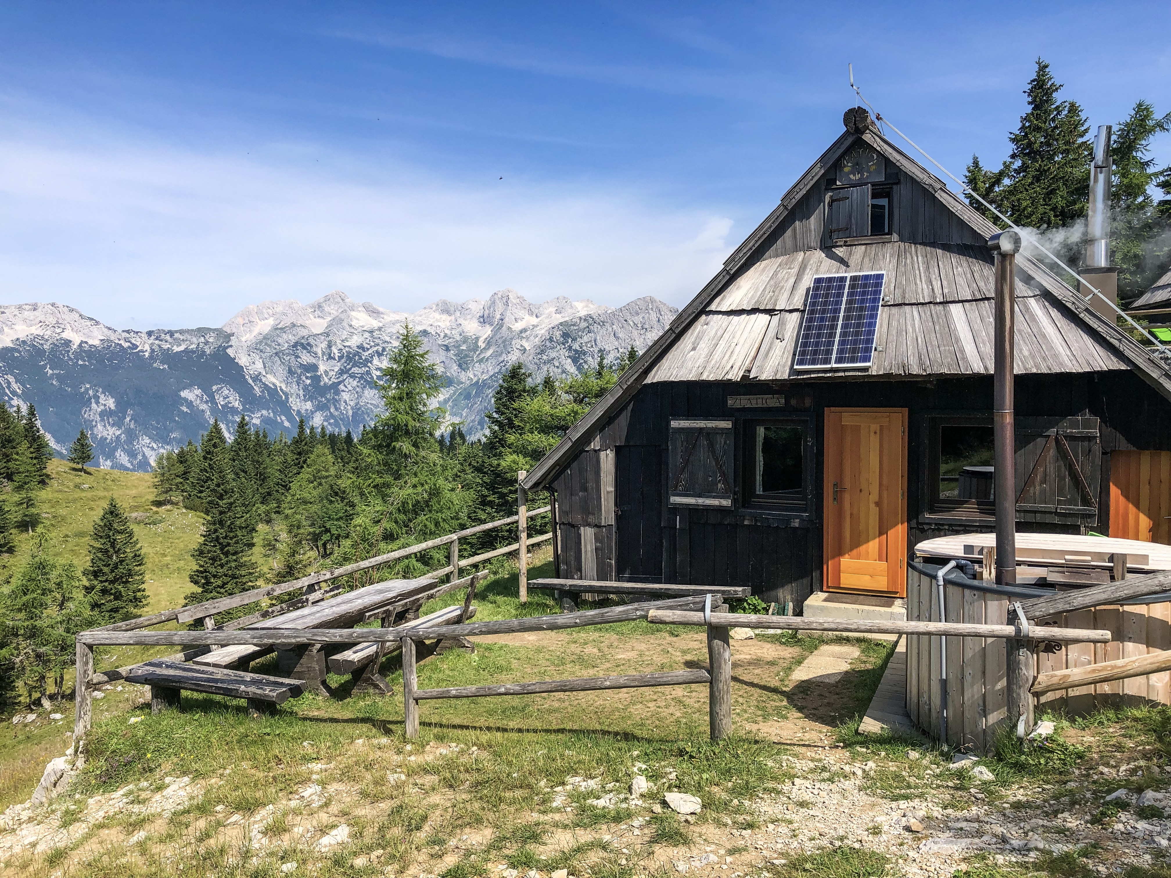 Hoog in de bergen heb je enkele mogelijkheden om te overnachten. Een traditionele herdershutje met een eigen hout gestookte hottub voor de deur was ons paradijsje voor 2 nachten. In de avond gingen wij vaak nog even op pad. De lift is dan dicht dus alle toeristen zijn weer naar beneden en je hebt de plek bijna voor je alleen. Al wandelend over mooie bergpaadjes, zakte de zon langzaam achter de bergen en zorgde voor dat o-zo-mooie gouden avondlicht. Ondertussen plukten de kinderen bloemetjes in de bergweides en knuffelden ze een kalfje wat we onderweg tegenkwamen. Terug bij onze hut sliepen de kinderen binnen no-time na een intensieve dag in de heerlijke berglucht. Joris en ik gooiden een extra houtblok in het oventje van de hottub en ontspanden in het heerlijk warme water. Met een Sloveens wijntje genoten wij van het laatste streepje zonlicht en het fenomenale uitzicht op de bergtoppen.