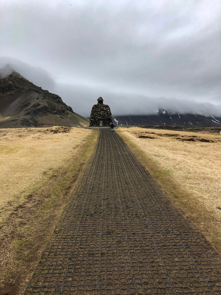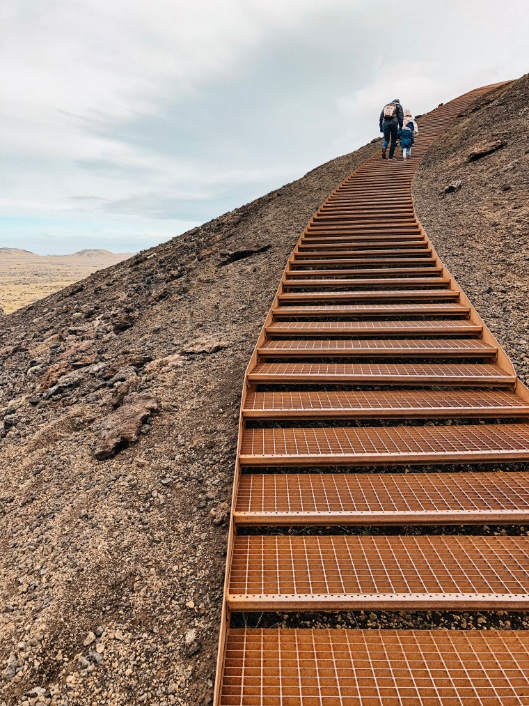 Aangezien je op Snæfellsnes alle natuurfenomenen van IJsland vindt, is er natuurlijk ook een vulkaankrater. De Saxhöll krater ligt in Snæfellsjökull National Park en kun je makkelijk met kinderen beklimmen. Er loopt namelijk een trap omhoog naar de top waar je een kijkje kunt nemen in de krater. Na een klimtocht naar boven komen we op de top aan waar het echt enorm hard waait. We hebben de grootste lol! Je kunt letterlijk hangen in de wind zonder om te vallen. Daarnaast kunnen we kilometers weg kijken en hebben we een geweldig uitzicht op de landschappen en zee rondom de vulkaan. Je kunt in het landschap goed zien hoe de lavastroom in het verleden is geweest.
