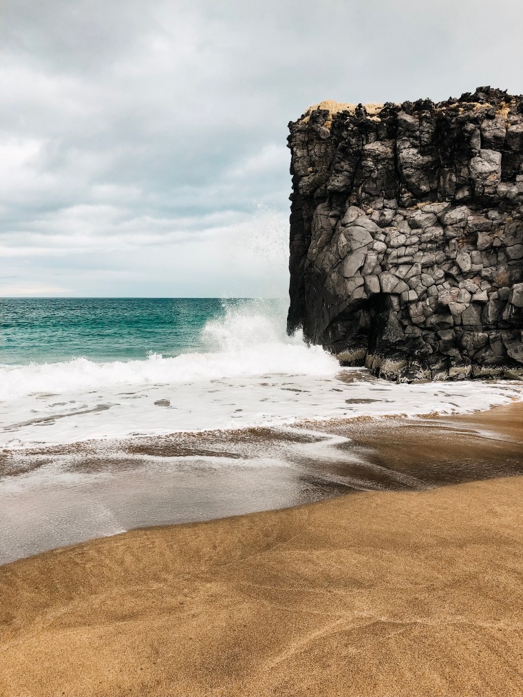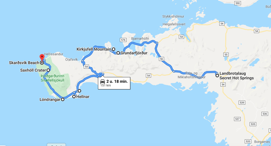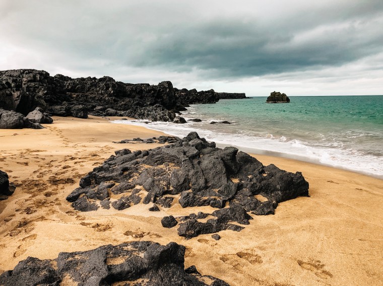 IJsland heeft voornamelijk zwarte stranden maar op Snaefellsnes zijn ook enkele goudgele stranden te vinden. Met onze huurauto rijden we een stukje over grindweg nr 579 (vanaf weg 574 neem je de afslag naar 579). Vanaf het moment dat we van de hoofdweg draaien, komen we nauwelijks nog iemand tegen. Na een tijdje parkeren we de auto op de plek van bestemming en klauteren over de rotsen richting het verlaten strand. Wow wat een uitzicht! De turquoise zee en het goudgele strand hebben een mooi contrast met het bijna zwarte vulkanische landschap. Ondertussen spelen de meiden op het strand en besluiten wij ter plekke om onze meegebrachte lunch op deze schitterende plek te nuttigen.