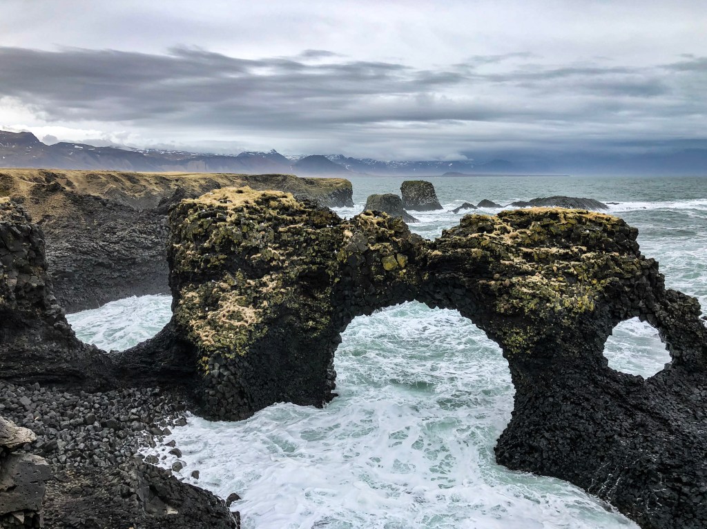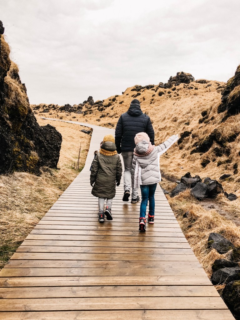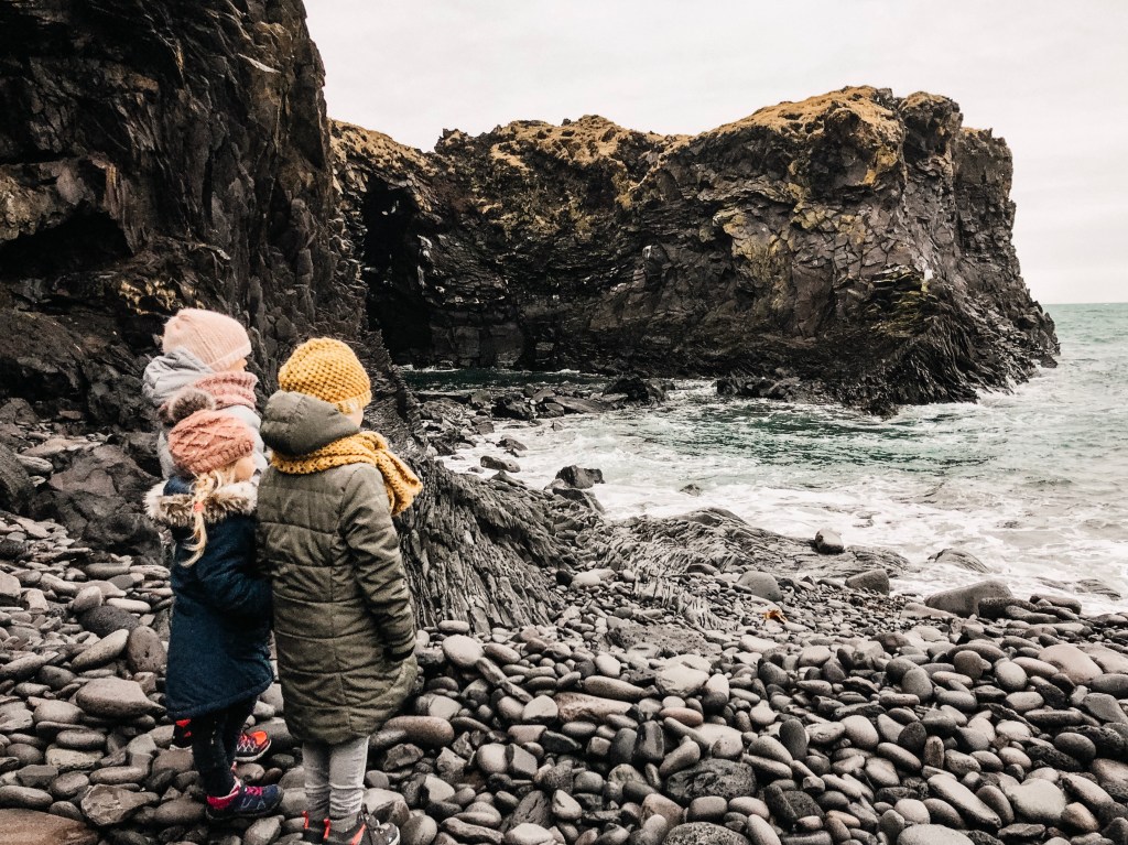 Vanuit Kirkjufell rijden we door naar onze accommodatie in Arnarstapi. Na het uitpakken van onze spullen en wat eten, gaan we nog even op pad. De omgeving is hier echt zo ontzettend mooi. In Arnarstapi vind je ruige kliffen waar de woeste zee flink tegenaan beukt. Vogels broeden graag in holletjes in de kliffen en het is er dan ook een drukte en herrie van jewelste! Ook begint hier een leuke wandeling die wat afstand betreft heel geschikt is voor kinderen (enkele reis 2,5 km). De route voert van Arnarstapi naar het plaatsje Hellnar en neemt je mee dwars door lavavelden en langs de schitterende ruige kustlijn. Er is een wandelpad aangelegd wat afgebakend is met palen en touw. Onze kinderen moeten van ons tijdens de wandeling echt op het pad blijven want de kliffen zijn erg stijl en hoog! Onderweg hebben we echt schitterende uitzichten op o.a. ‘the arch’: een natuurlijk gevormde boog van steen. Het wandelen, klimmen en klauteren door lavavelden is een grote hit bij onze meiden. De kopafbeelding van dit artikel is tijdens deze wandeling gemaakt.